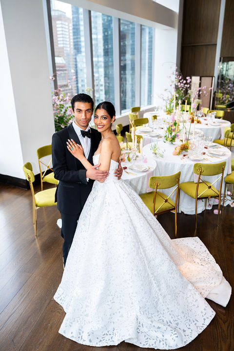 K&F picked the HousingWorks Bookstore for the setting for their winter wedding for its mission, and for its cameo in a Taylor Swift music video. They wanted an event design that was modern, minimalist, glamorous, and touched on that classic, NYC elegance, yet their wedding venue is an inherently warm, glowy, and cozy space. The books that line the walls offer a cacophony of color; the worn wood interior is hygge but not exactly glam. We wanted to create an event design that honored the space and setting, while capturing the more modern and sleek elements that resonated with the couples.