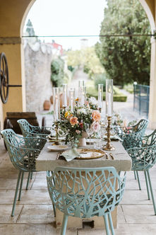 For the reception decor, I loved pairing the modern-art style chairs and minimalist, sleek menus with the more classic silk napkins and brass candlesticks, playing off the old-meets-new contrast. The etched glassware featured twisting vines that added that organic element, contrasting the crisp, clean lines of the place cards. These series of little push/pull contrasts created their own design element! We also took advantage of the beautiful, raw concrete table up in the hidden loggia at Villa Agape. Paired with the ultra-traditional gilded Florentine under plates, we created yet another high/low, elegant/organic contrast that let both elements shine.